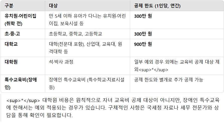자녀 교육비 공제 한도(유치원·초중고 300만 원, 대학 900만 원 등)