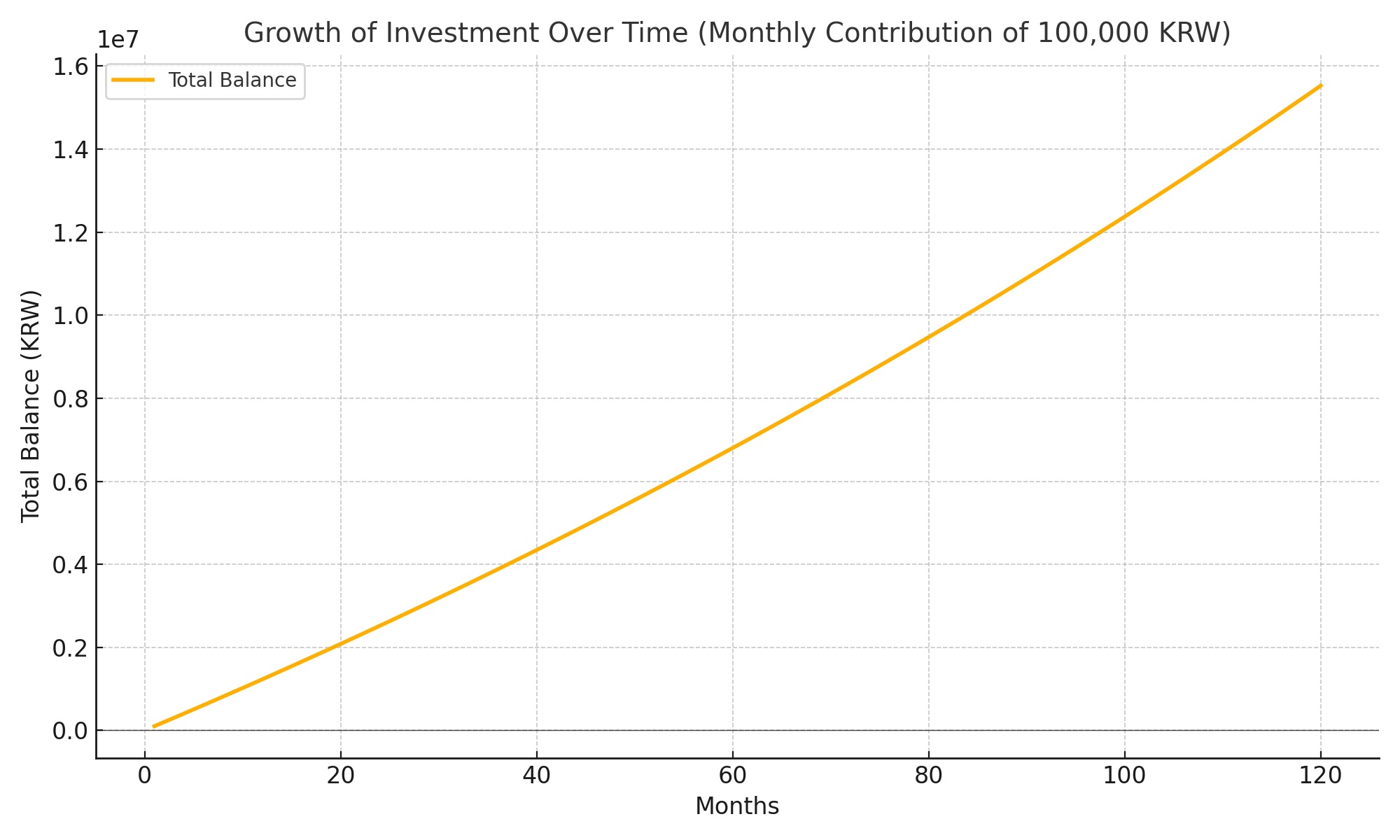 월 10만 원을 연 5% 수익률로 10년 투자하면 약 1,550만 원이 됩니다.